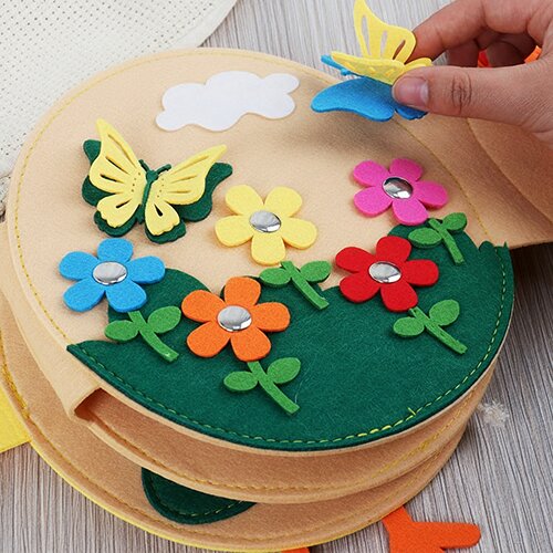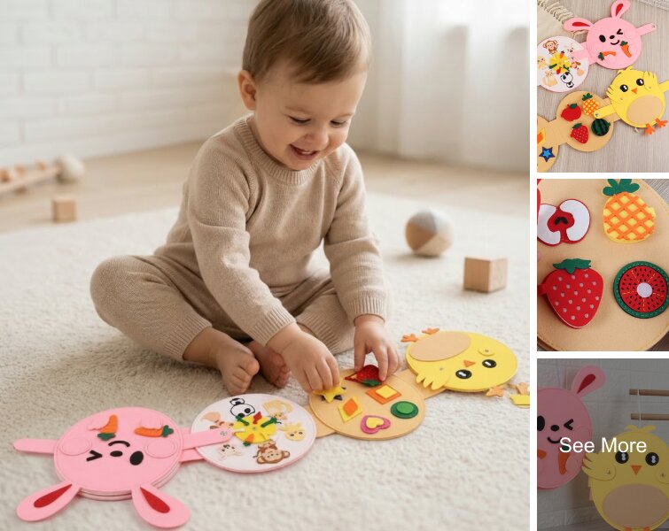 Why I Picked It: Eight pages of hands-on learning tucked inside the softest little felt book — and it folds down to the size of a wallet. Each page is a different activity: pulling carrots, snapping butterfly wings, lacing, buttoning, spinning a matching wheel, peek-a-boo animal flaps. Every single one quietly builds grip strength, finger control, and focused attention.
