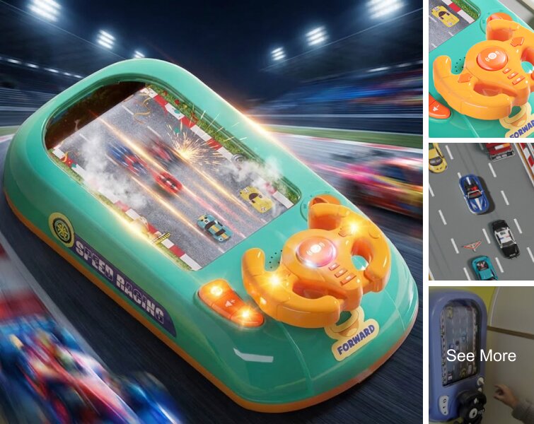 Why I Picked It: Kids don’t just press buttons on this one — they actually drive. The real steering wheel, gear shifts, and speed controls make every race feel physical and immersive. Two modes (car racing and spaceship) keep things fresh, and 200 progressive challenges scale with ability.